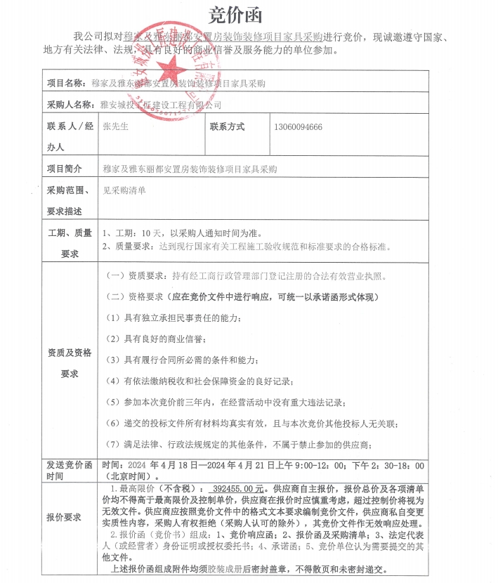 穆家及雅東麗都安置房裝飾裝修項目家具采購(第二次)競價公告
