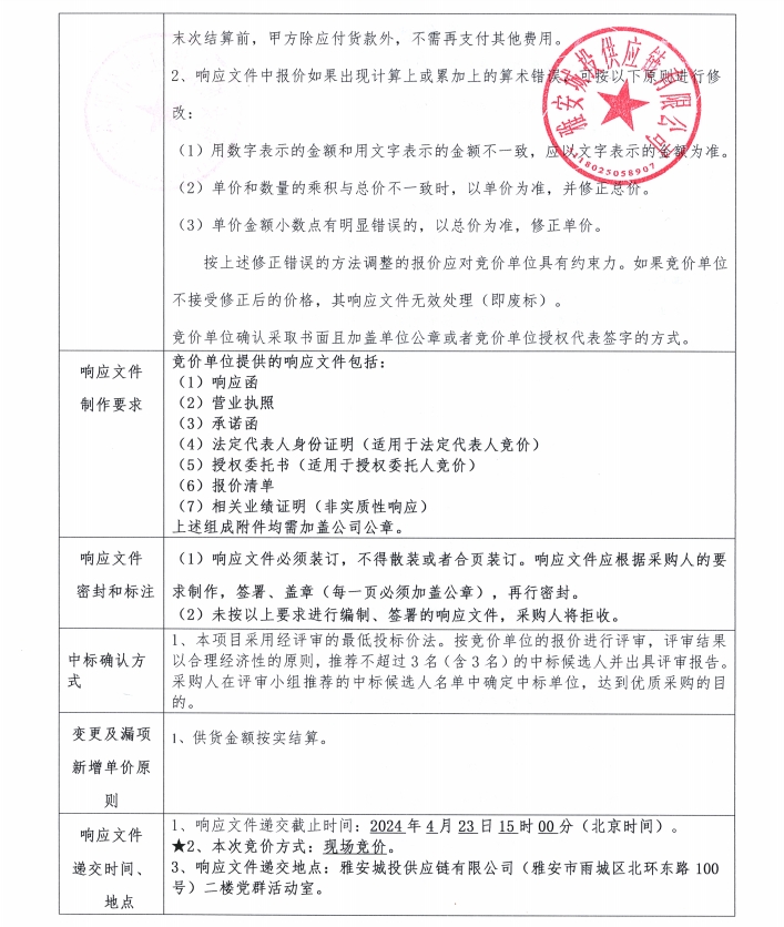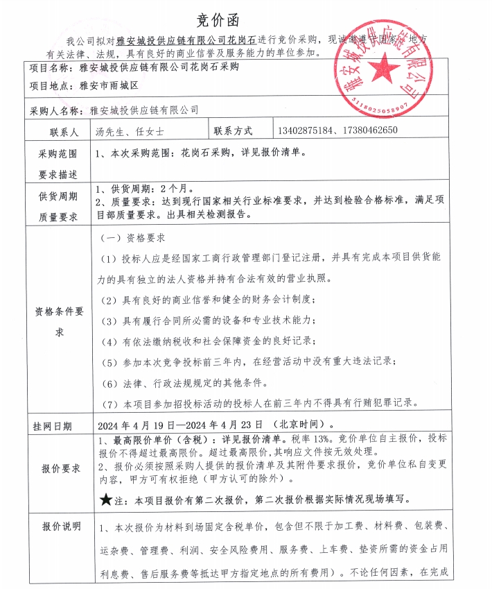 雅安城投供應鏈有限公司花崗石采購競價公告