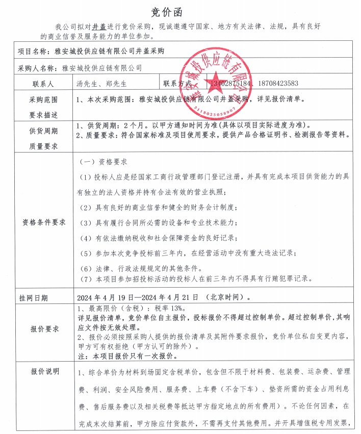 雅安城投供應(yīng)鏈有限公司井蓋采購競價公告