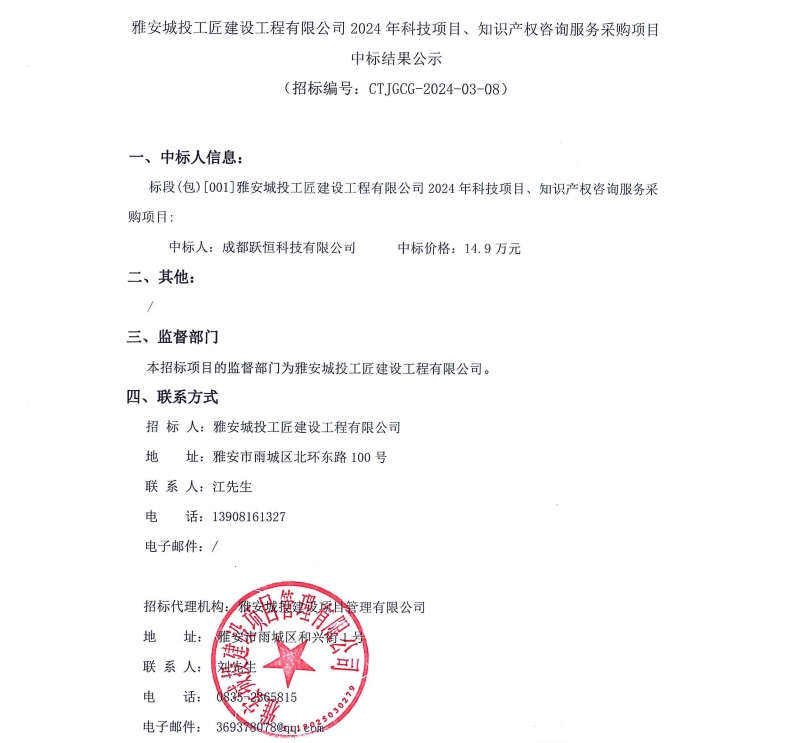 雅安城投工匠建設(shè)工程有限公司2024年科技項(xiàng)目、知識(shí)產(chǎn)權(quán)咨詢服務(wù)采購(gòu)項(xiàng)目中標(biāo)結(jié)果公示
