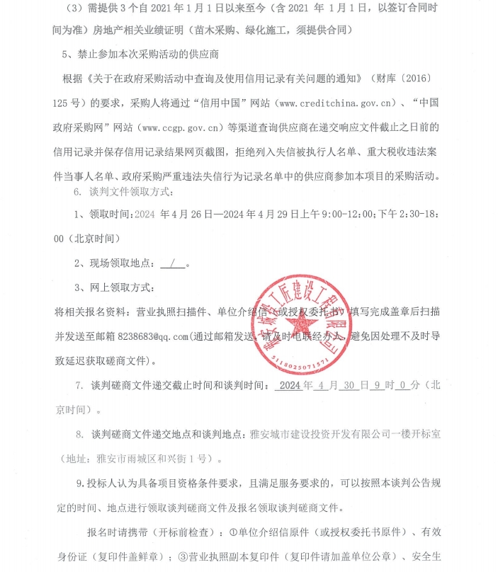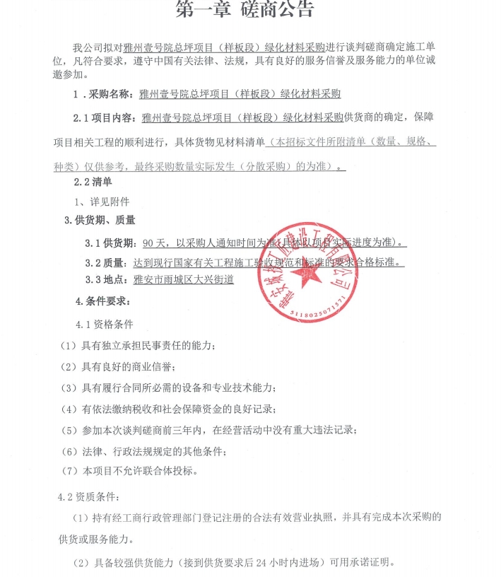 雅州壹號(hào)院總坪項(xiàng)目(樣板段)綠化材料采購談判磋商公告