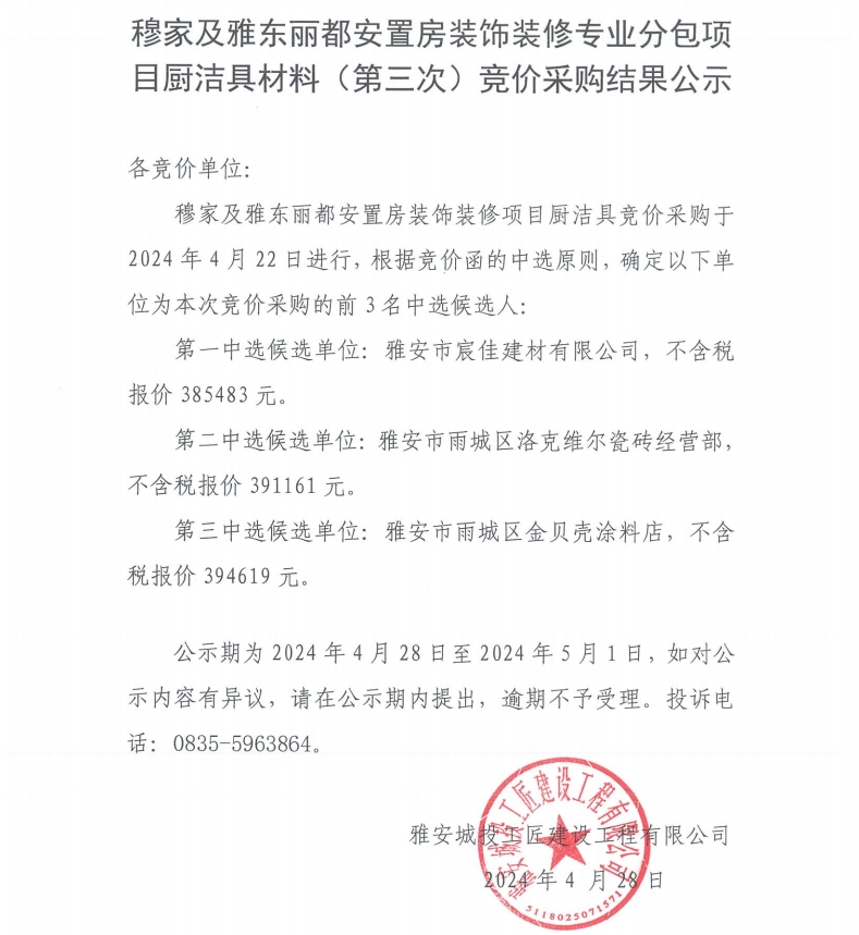 穆家及雅東麗都安置房裝飾裝修專業(yè)分包項(xiàng)目潔具材料(第三次)競(jìng)價(jià)采購結(jié)果公示
