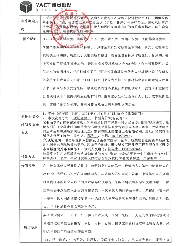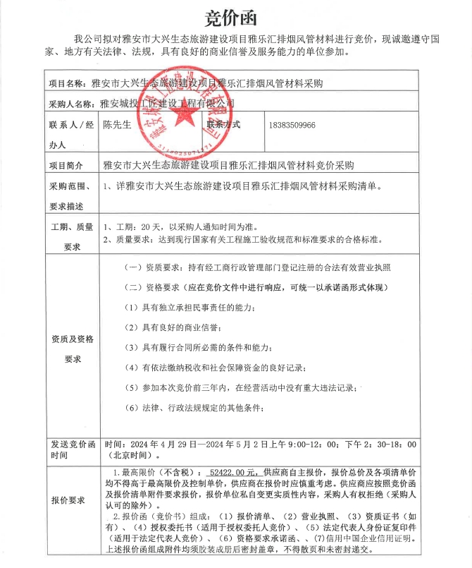 雅安市大興生態(tài)旅游建設(shè)項(xiàng)目雅樂匯排煙風(fēng)管材料采購競(jìng)價(jià)公告
