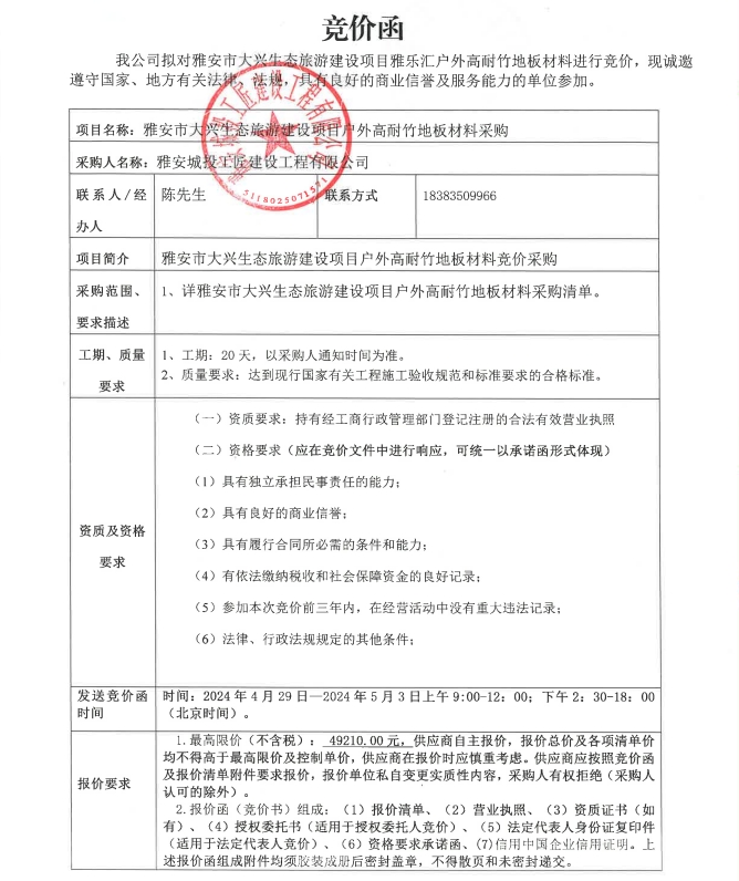 雅安市大興生態(tài)旅游建設項目霽雨橋、木棧道戶外高耐竹地板材料采購競價公告