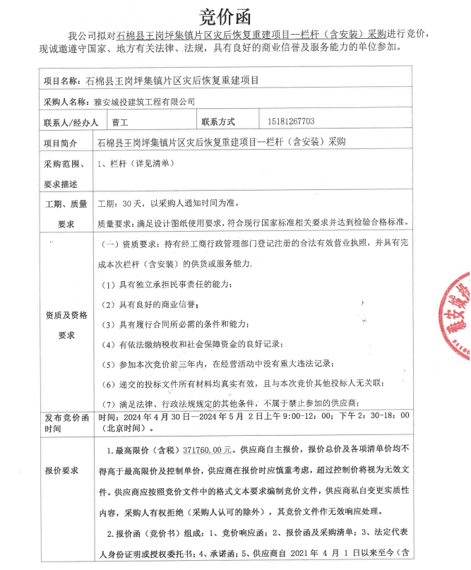 石棉縣王崗坪集鎮(zhèn)片區(qū)災后恢復重建項目--欄桿(含安裝)采購競價公告