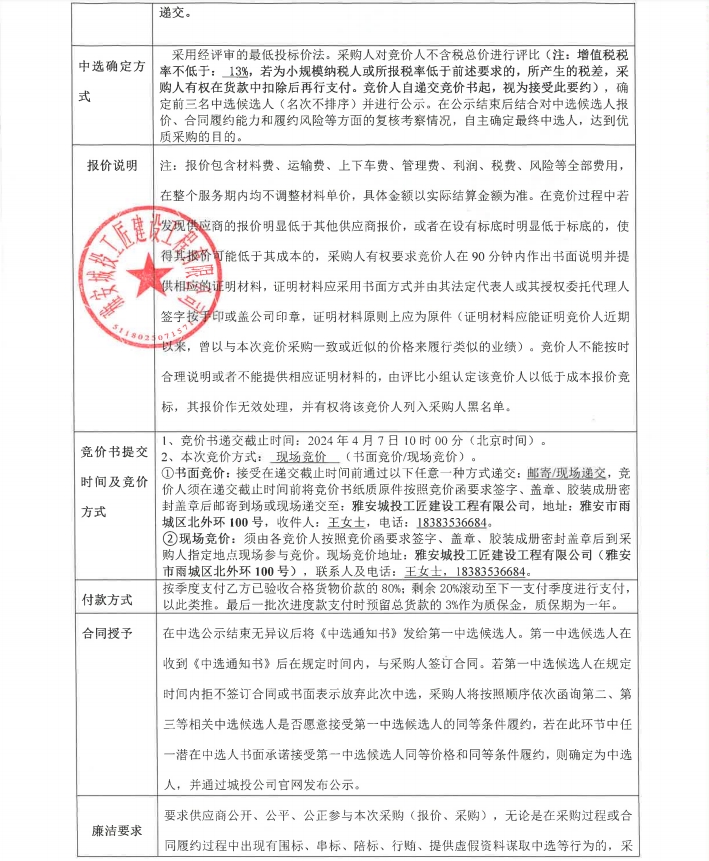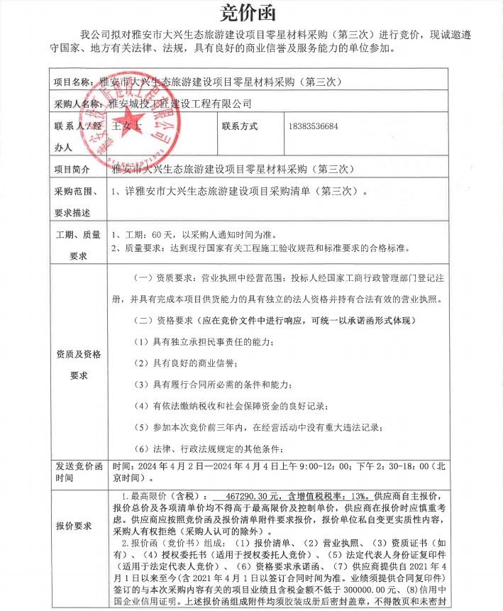 雅安市大興生態(tài)旅游建設(shè)項(xiàng)目零星材料采購(第三次)競價(jià)公告