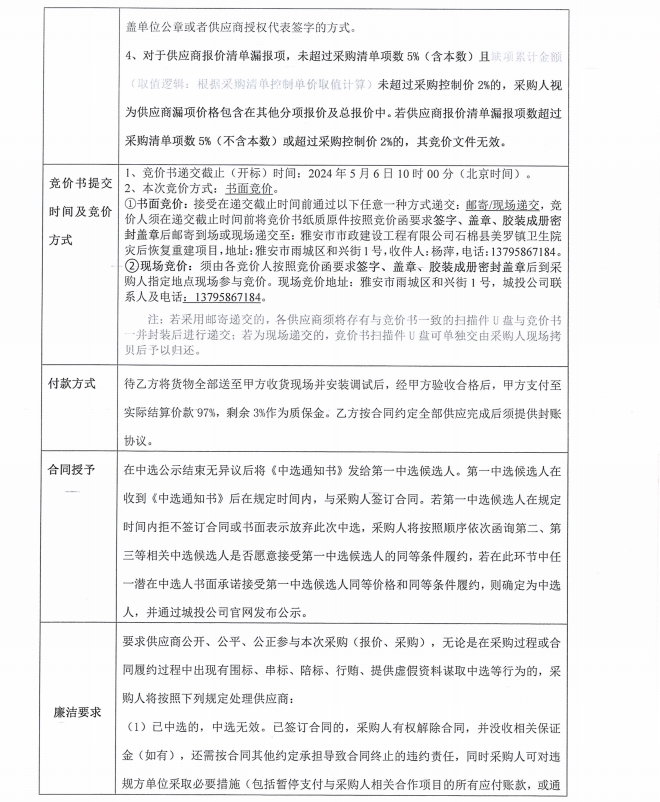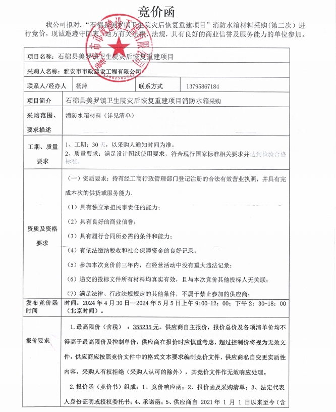 石棉縣美羅鎮(zhèn)衛(wèi)生院災后恢復重建項目消防水箱采購(第二次)競價公告
