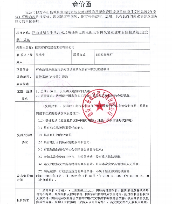 蘆山縣城鄉(xiāng)生活污水垃圾處理設(shè)施及配套管網(wǎng)恢復(fù)重建項(xiàng)目監(jiān)控系統(tǒng)(含安裝)采購內(nèi)容競價(jià)公告