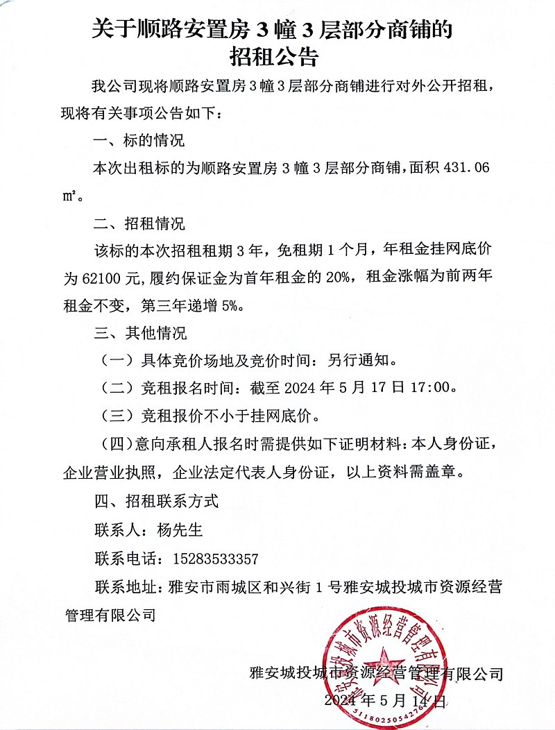 關(guān)于順路安置房3幢3層部門商鋪的招租公告
