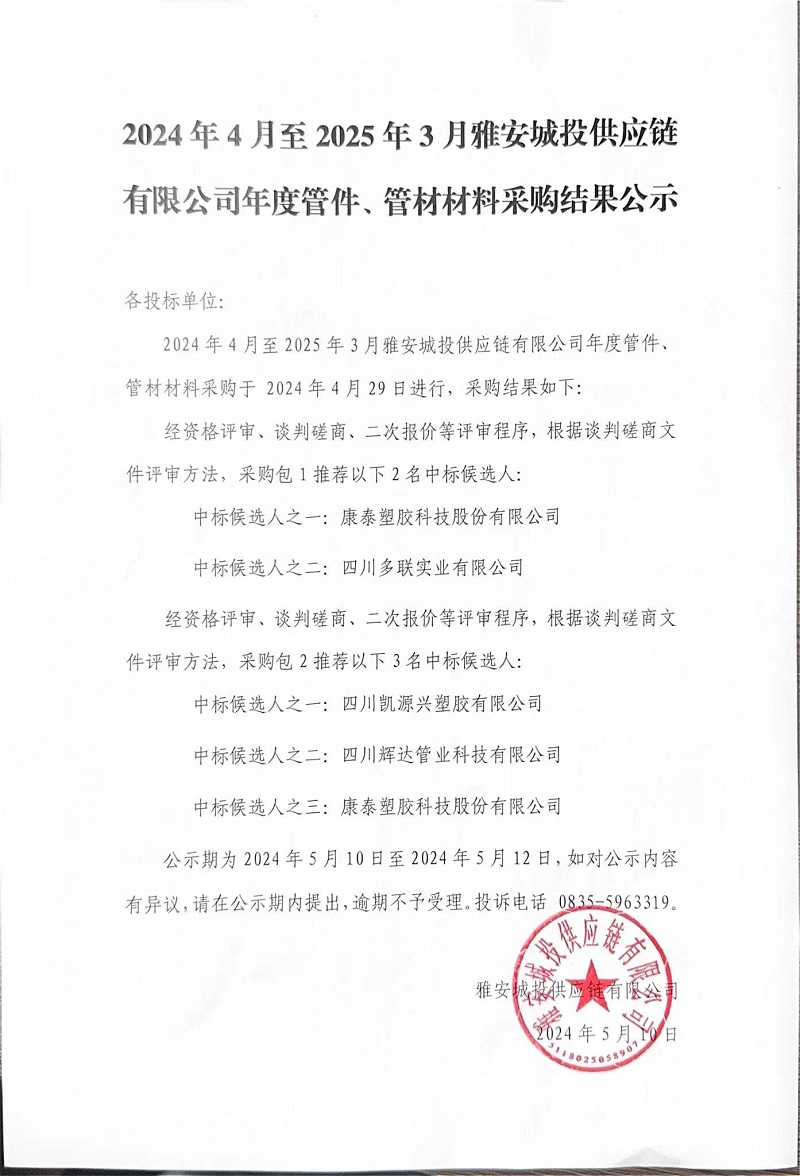 2024年4月至2025年3月雅安城投供應(yīng)鏈有限公司年度管件、管材材料采購(gòu)結(jié)果公示