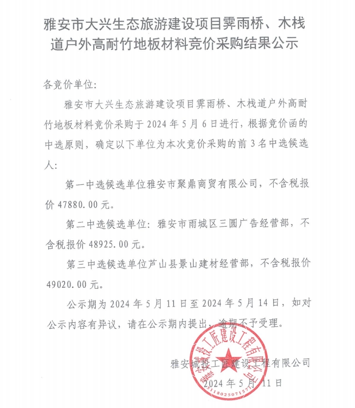 雅安市大興生態(tài)旅游建設(shè)項(xiàng)目霽雨橋、木棧道戶外高耐竹地板材料競價(jià)采購結(jié)果公示