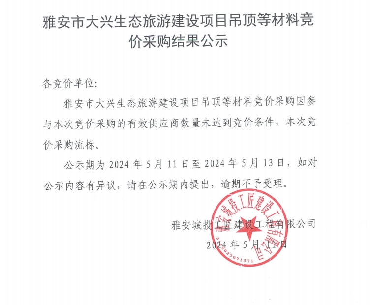 雅安市大興生態(tài)旅游建設項目吊頂?shù)炔牧细們r采購結(jié)果公示