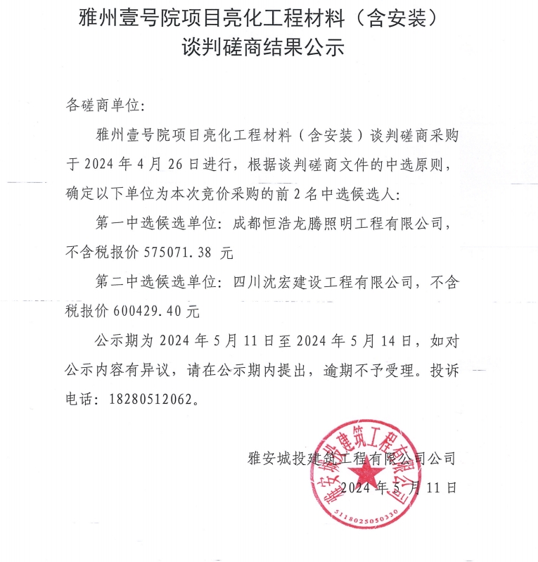 雅州壹號院項目亮化工程材料(含安裝)談判磋商結果公示