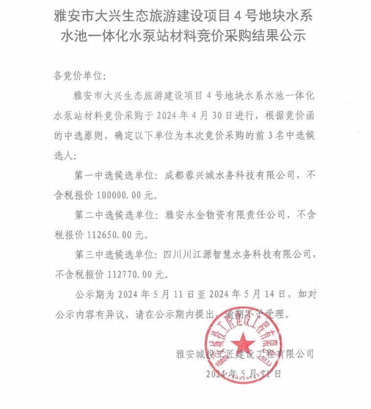 雅安市大興生態(tài)旅游建設(shè)項(xiàng)目4號(hào)地塊水系水池一體化水泵站材料競(jìng)價(jià)采購(gòu)結(jié)果公示