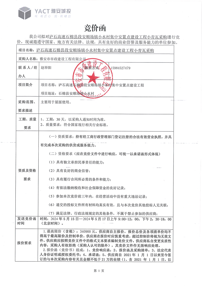 瀘石高速石棉縣段安順場鎮(zhèn)小水村集中安置點(diǎn)建設(shè)工程項(xiàng)目施工瓦片采購競價(jià)公告