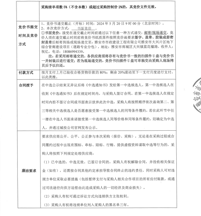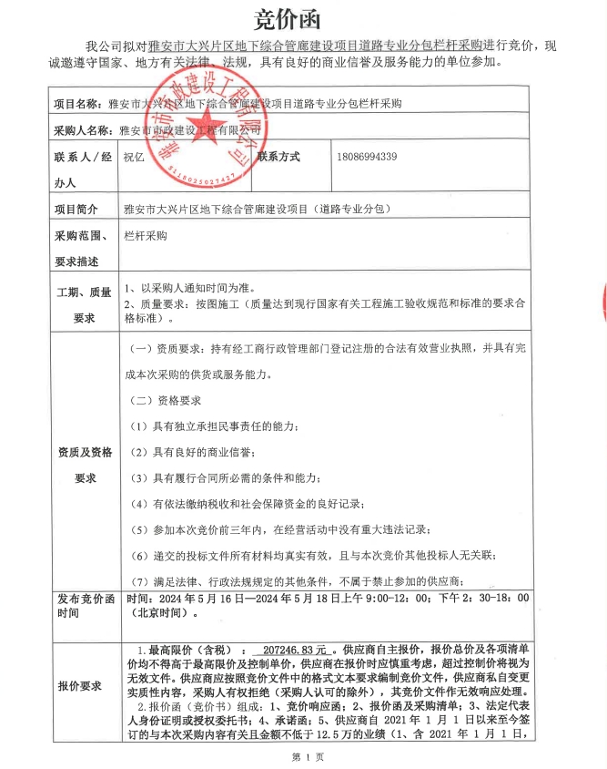 雅安市大興片區(qū)地下綜合管廊建設(shè)項目道路專業(yè)分包欄桿采購競價公告