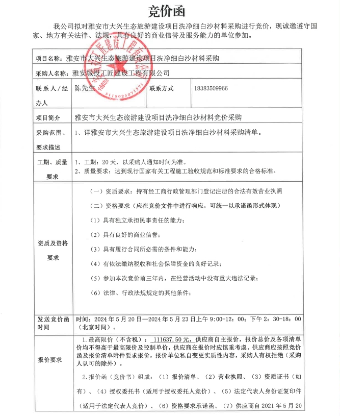 雅安市大興生態(tài)旅游建設(shè)項目洗凈細(xì)白沙材料采購競價公告