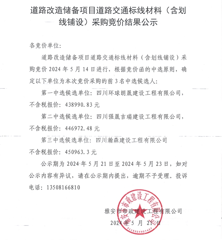 道路改造儲備項目道路交通標線材料(含劃線鋪設)采購競價結(jié)果公示