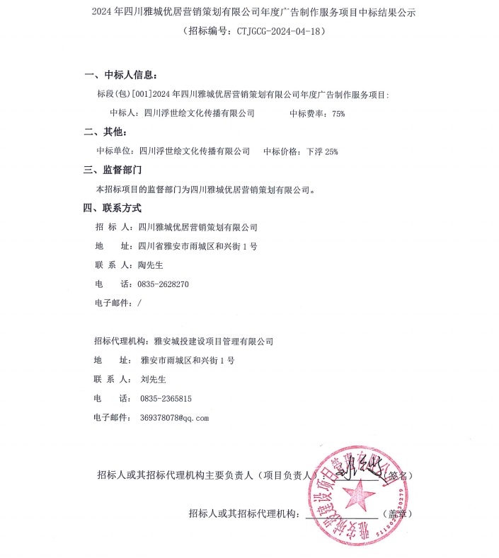 2024年四川雅城優(yōu)居營銷策劃有限公司年度廣告制作服務(wù)項(xiàng)目中標(biāo)結(jié)果公示