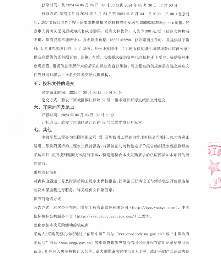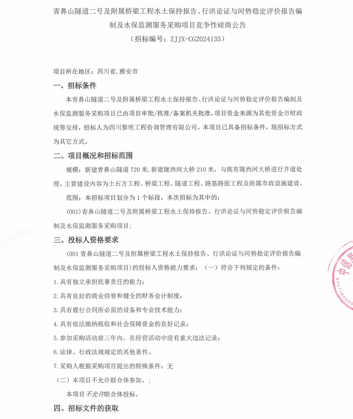 青鼻山隧道二號及附屬橋梁工程水土保持報告、行洪論證與河勢穩(wěn)定評價報告編制及水保監(jiān)測服務采購項目競爭性磋商公告