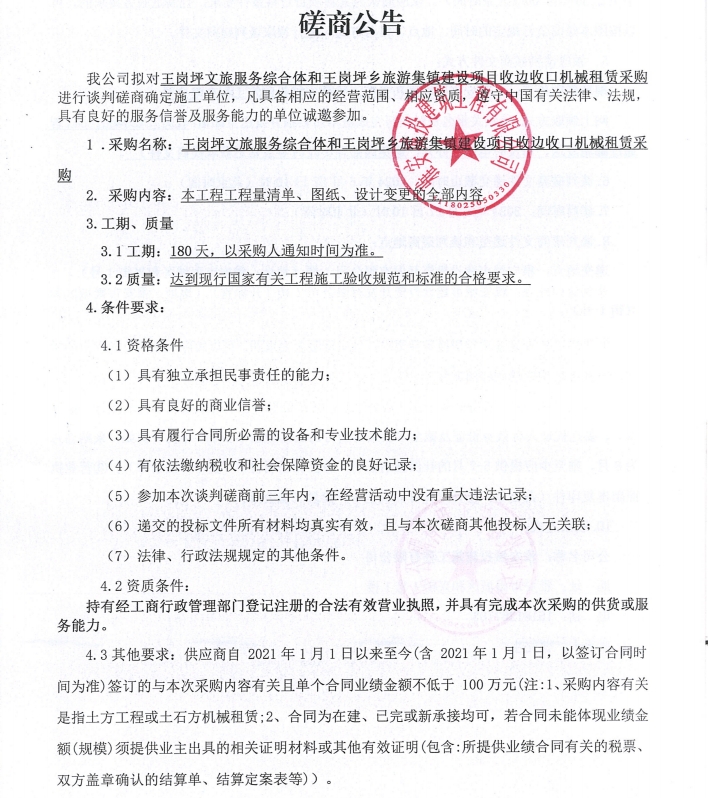 王崗坪文旅服務(wù)綜合體和王崗坪鄉(xiāng)旅游集鎮(zhèn)建設(shè)項目收邊收口機械租賃采購談判磋商公告