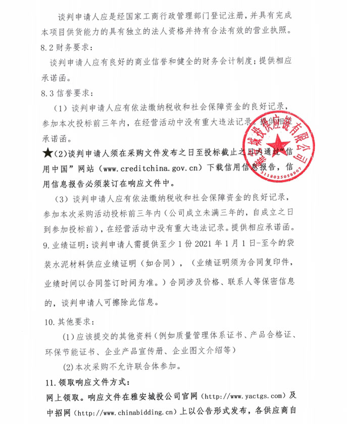 2024年6月至2025年5月雅安城投供應(yīng)鏈有限公司年度袋裝水泥采購文件