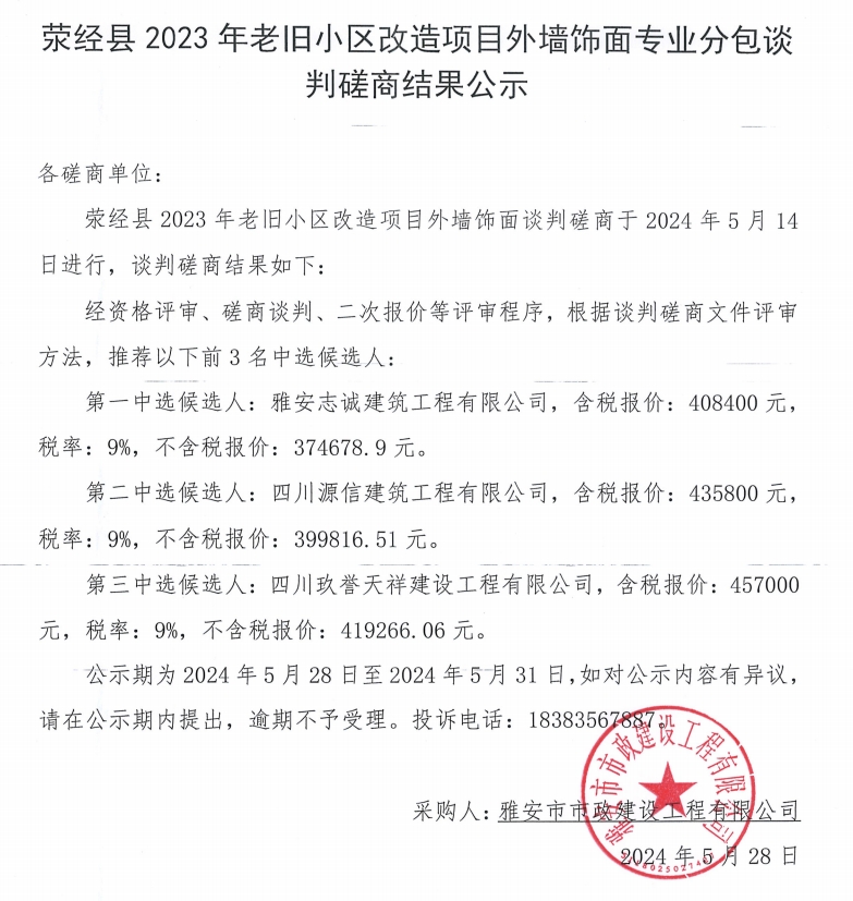 滎經(jīng)縣2023年老舊小區(qū)改造項目外墻飾面專業(yè)分包談判磋商結(jié)果公示