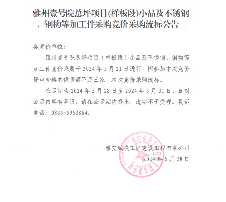 雅州壹號院總坪項目(樣板段)小品及不銹鋼、鋼構(gòu)等加工件采購競價采購流標公告