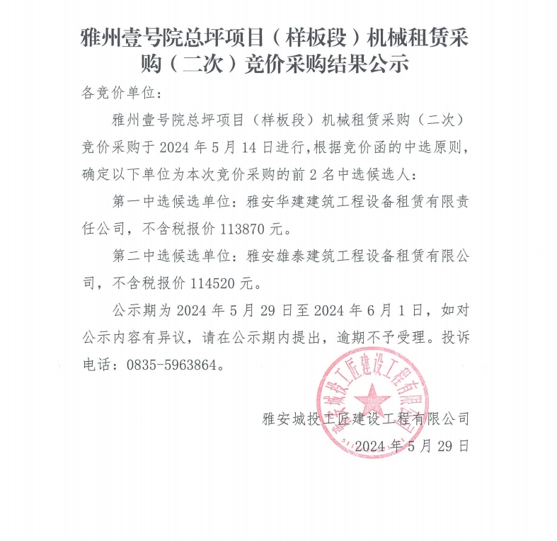 雅州壹號院總坪項目(樣板段)機械租賃采購(二次)競價采購結(jié)果公示