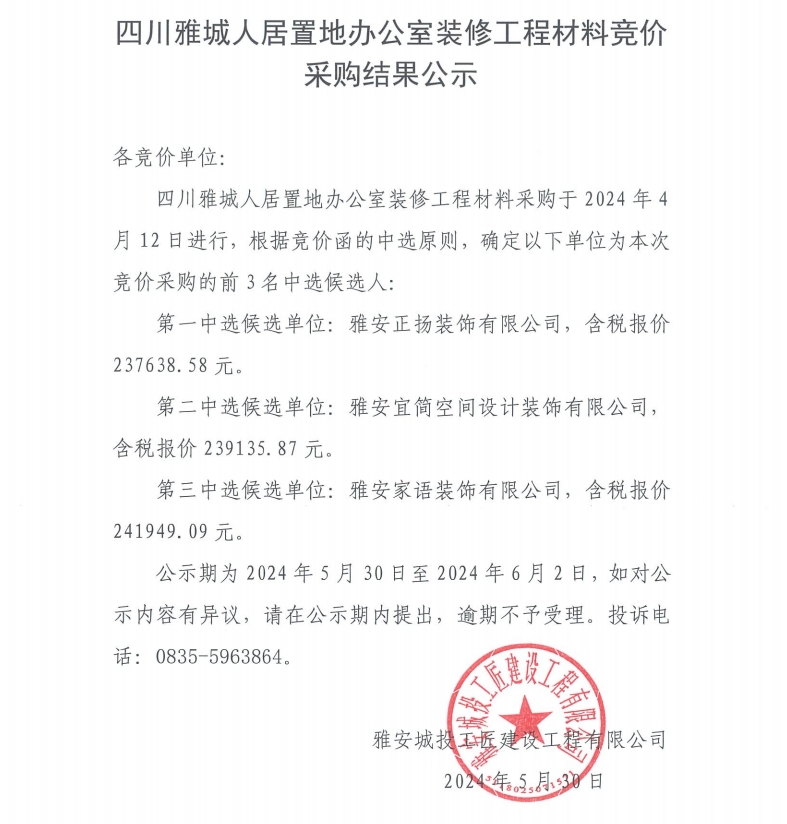 四川雅城人居置地辦公室裝修工程材料競價采購結(jié)果公示