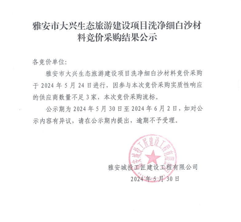 雅安市大興生態(tài)旅游建設(shè)項(xiàng)目洗凈細(xì)白沙材料競價(jià)采購結(jié)果公示