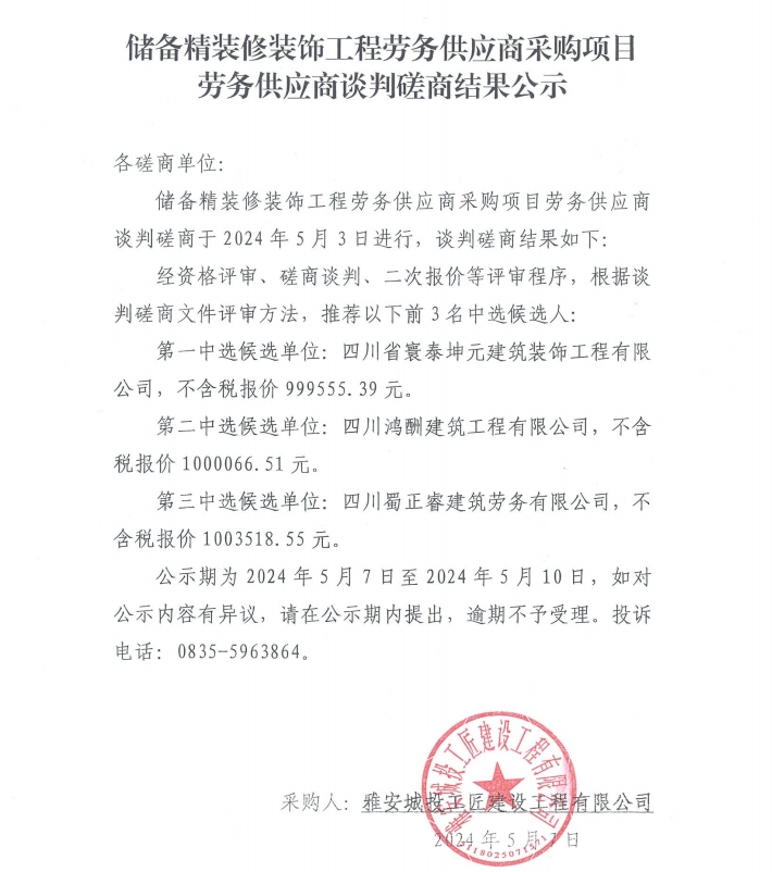 儲(chǔ)備精裝修裝飾工程勞務(wù)供應(yīng)商采購項(xiàng)目勞務(wù)供應(yīng)商談判磋商結(jié)果公示