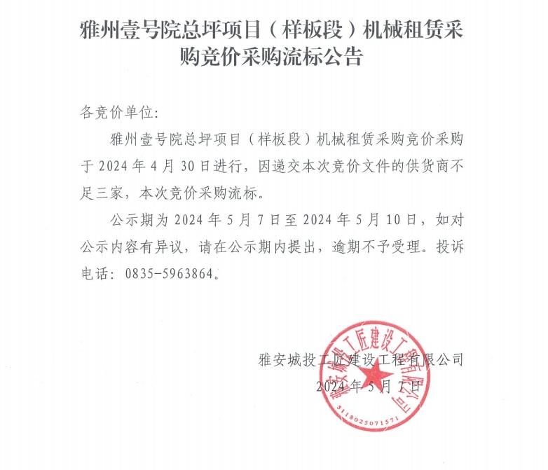 雅州壹號(hào)院總坪項(xiàng)目(樣板段)機(jī)械租賃采購競(jìng)價(jià)采購流標(biāo)公告
