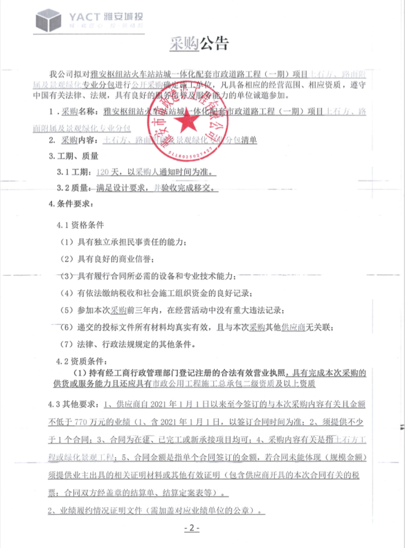 雅安樞紐站火車站站城一體化配套市政道路工程(一期)項目土石方、路面附屬及景觀綠化專業(yè)分包采購公告