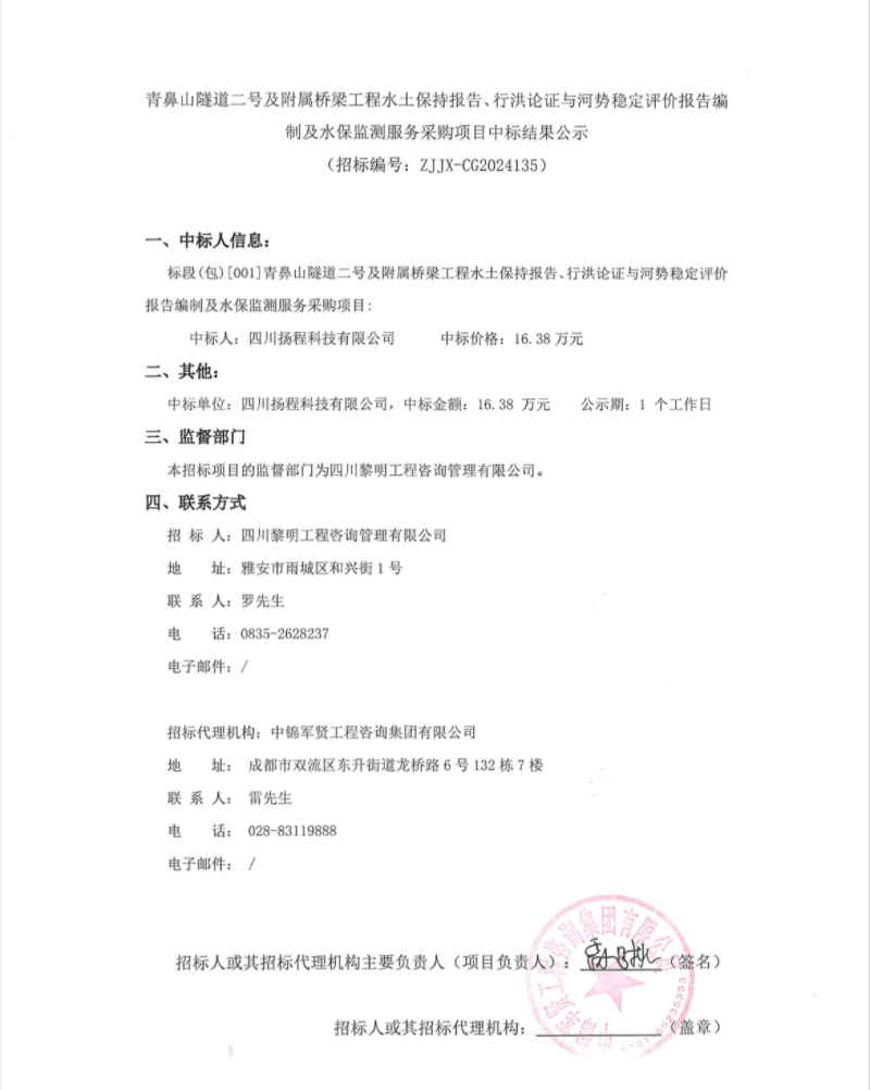 青鼻山隧道二號(hào)及附屬橋梁工程水土保持報(bào)告、行洪論證與河勢(shì)穩(wěn)定評(píng)價(jià)報(bào)告編制及水保監(jiān)測(cè)服務(wù)采購項(xiàng)目中標(biāo)結(jié)果公示
