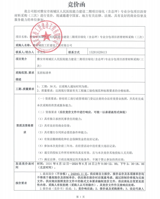 雅安市雨城區(qū)人民醫(yī)院能力建設(shè)二期項目綠化(含總坪)專業(yè)分包項目瀝青材料采購(三次)競價公告