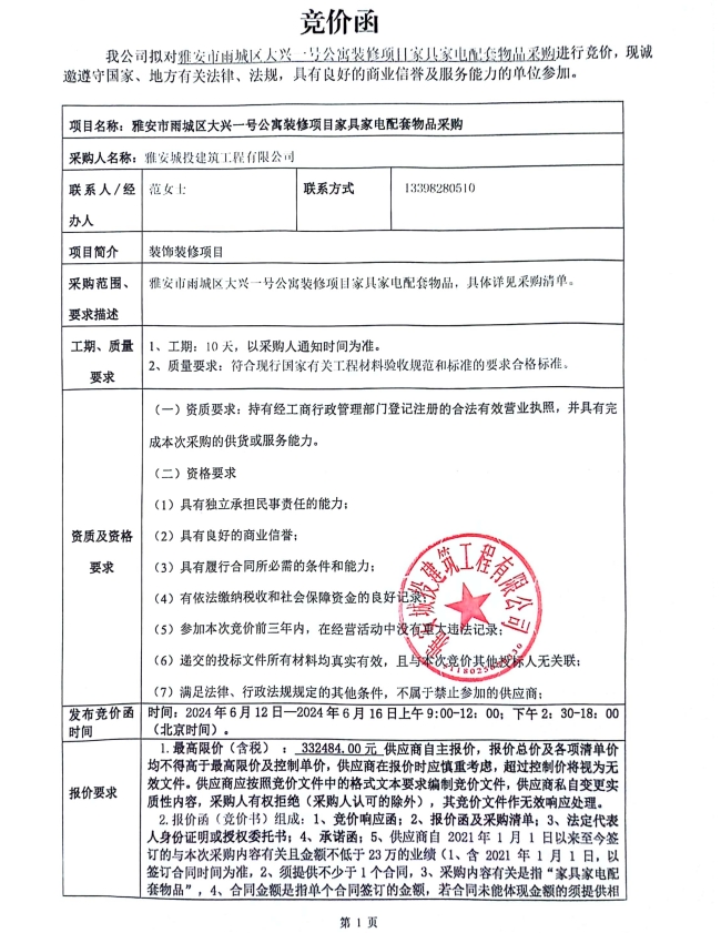 雅安市雨城區(qū)大興壹號(hào)公寓裝修項(xiàng)目家具電配套物品采購(gòu)競(jìng)價(jià)公告