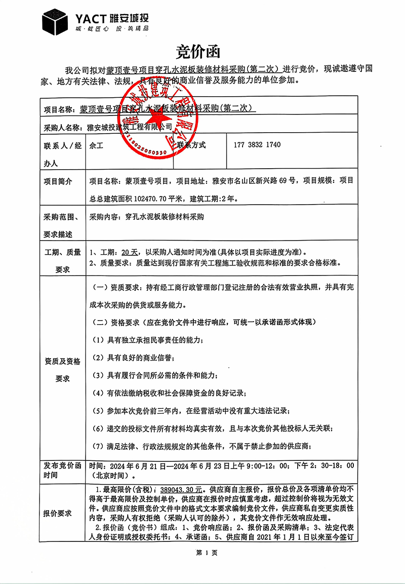 蒙頂壹號(hào)項(xiàng)目穿孔水泥板裝修材料采購(gòu)(第二次)競(jìng)價(jià)函