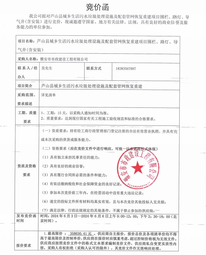 蘆山縣城鄉(xiāng)生活污水垃圾處理設(shè)施及配套管網(wǎng)恢復(fù)重建項(xiàng)目圍欄、路燈、導(dǎo)氣井(含安裝)采購競(jìng)價(jià)公告