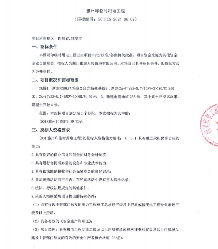 雅州印臨時(shí)用電工程招標(biāo)公告