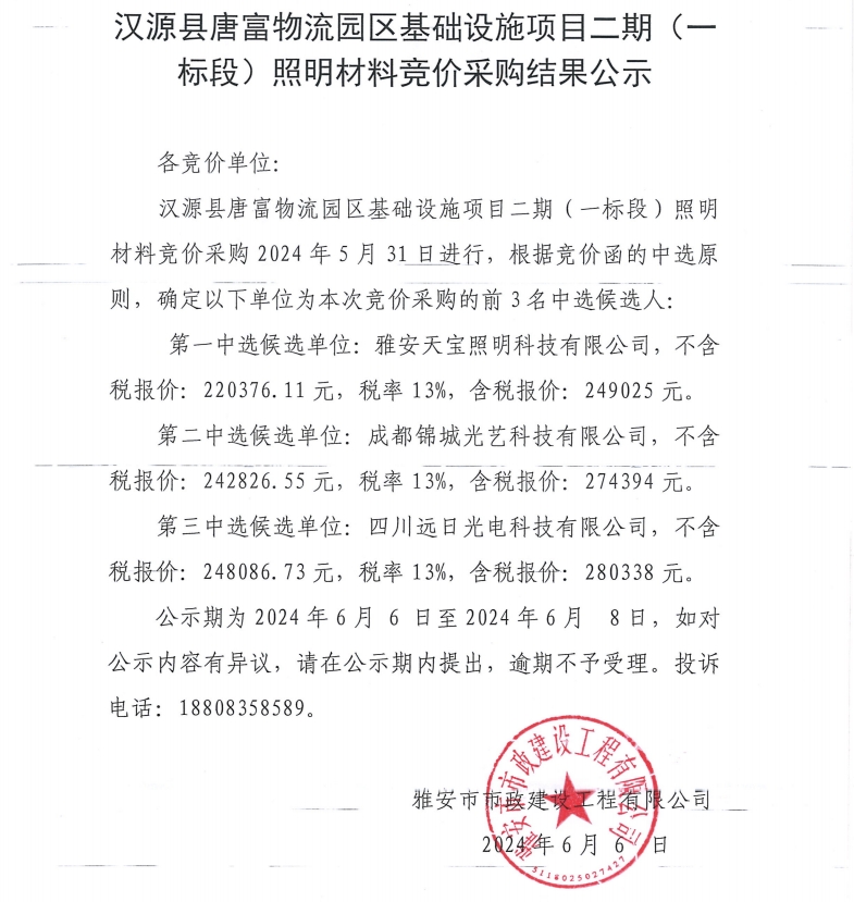 漢源縣唐富物流園區(qū)基礎(chǔ)設(shè)施項(xiàng)目二期(一標(biāo)段)照明材料競價采購結(jié)果公示