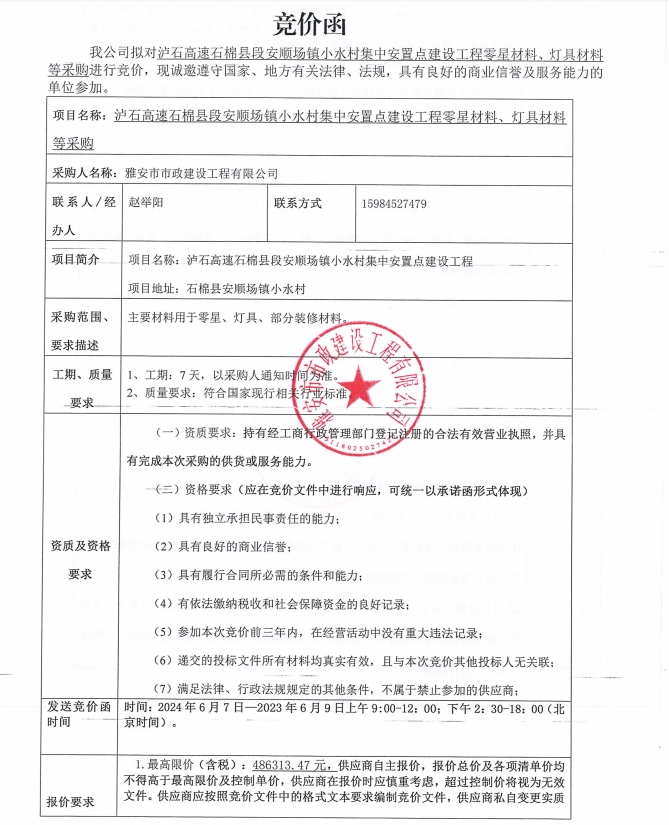 瀘石高速石棉縣段安順場(chǎng)鎮(zhèn)小水村集中安置點(diǎn)建設(shè)工程零星材料、燈具材料等采購(gòu)競(jìng)價(jià)公告