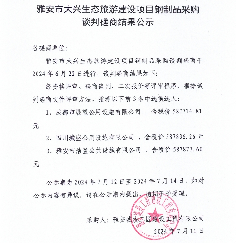 雅安市大興生態(tài)旅游建設(shè)項目鋼制品采購談判磋商結(jié)果公示