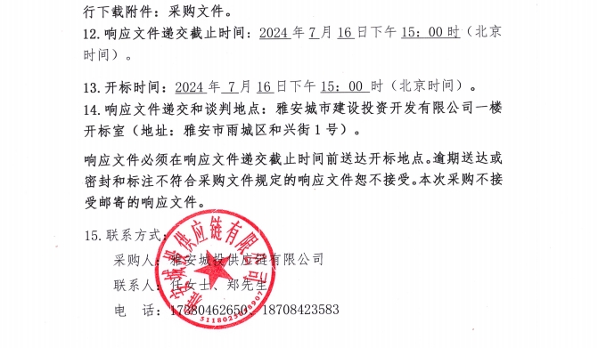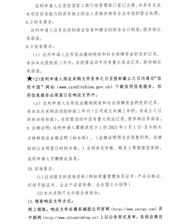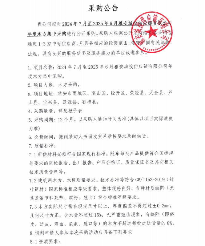 2024年7月至2025年6月雅安城投供應鏈有限公司年度木方集中采購公告