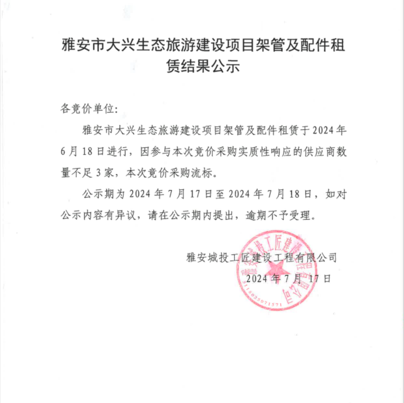 雅安市大興生態(tài)旅游建設項目架管及配件租賃結果公示