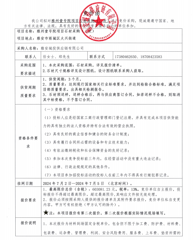 雅州壹號院項(xiàng)目石材采購(二次)競價(jià)公告