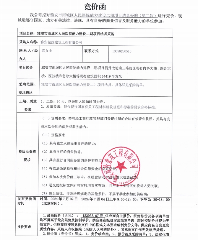 雅安市雨城區(qū)人民醫(yī)院能力建設(shè)二期項(xiàng)目潔具采購(第二次)競價(jià)公告