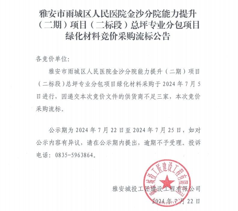 雅安市雨城區(qū)人民醫(yī)院金沙分院能力提升(二期)項目(二標段)總坪專業(yè)分包項目綠化材料競價采購流標公告