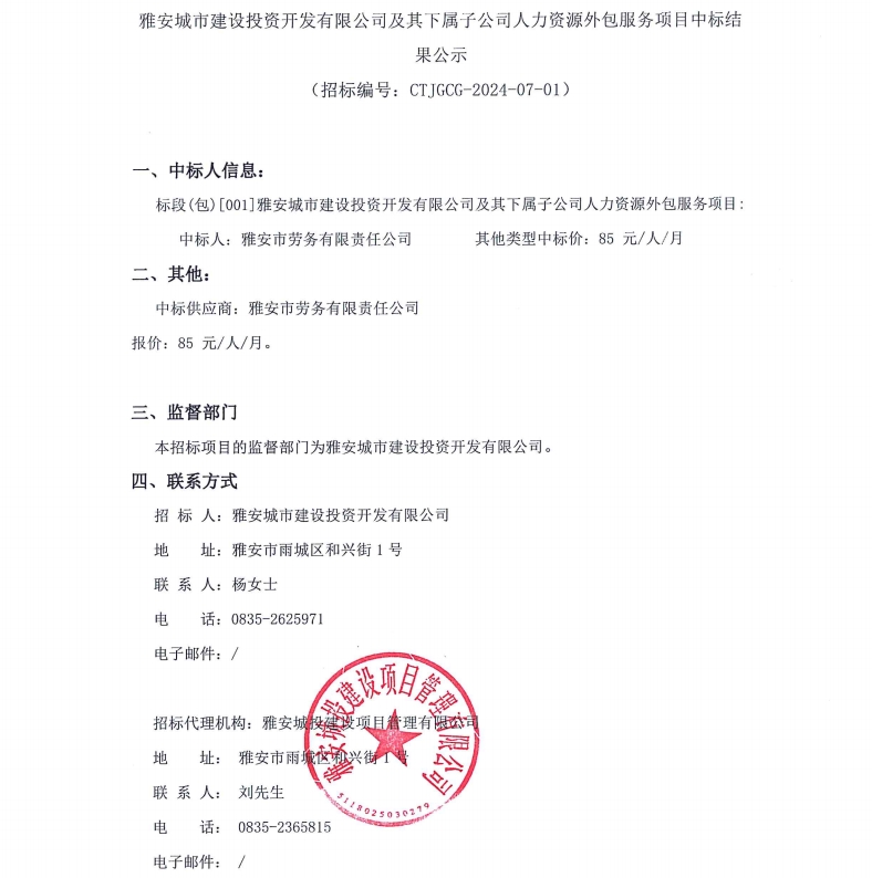 雅安城市建設(shè)投資開(kāi)發(fā)有限公司及其下屬子公司人力資源外包服務(wù)項(xiàng)目中標(biāo)結(jié)果公示