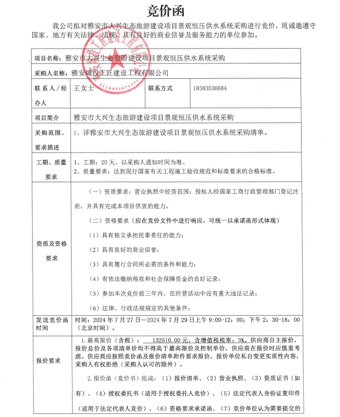 雅安市大興生態(tài)旅游建設(shè)項(xiàng)目景觀恒壓供水系統(tǒng)采購競(jìng)價(jià)公告